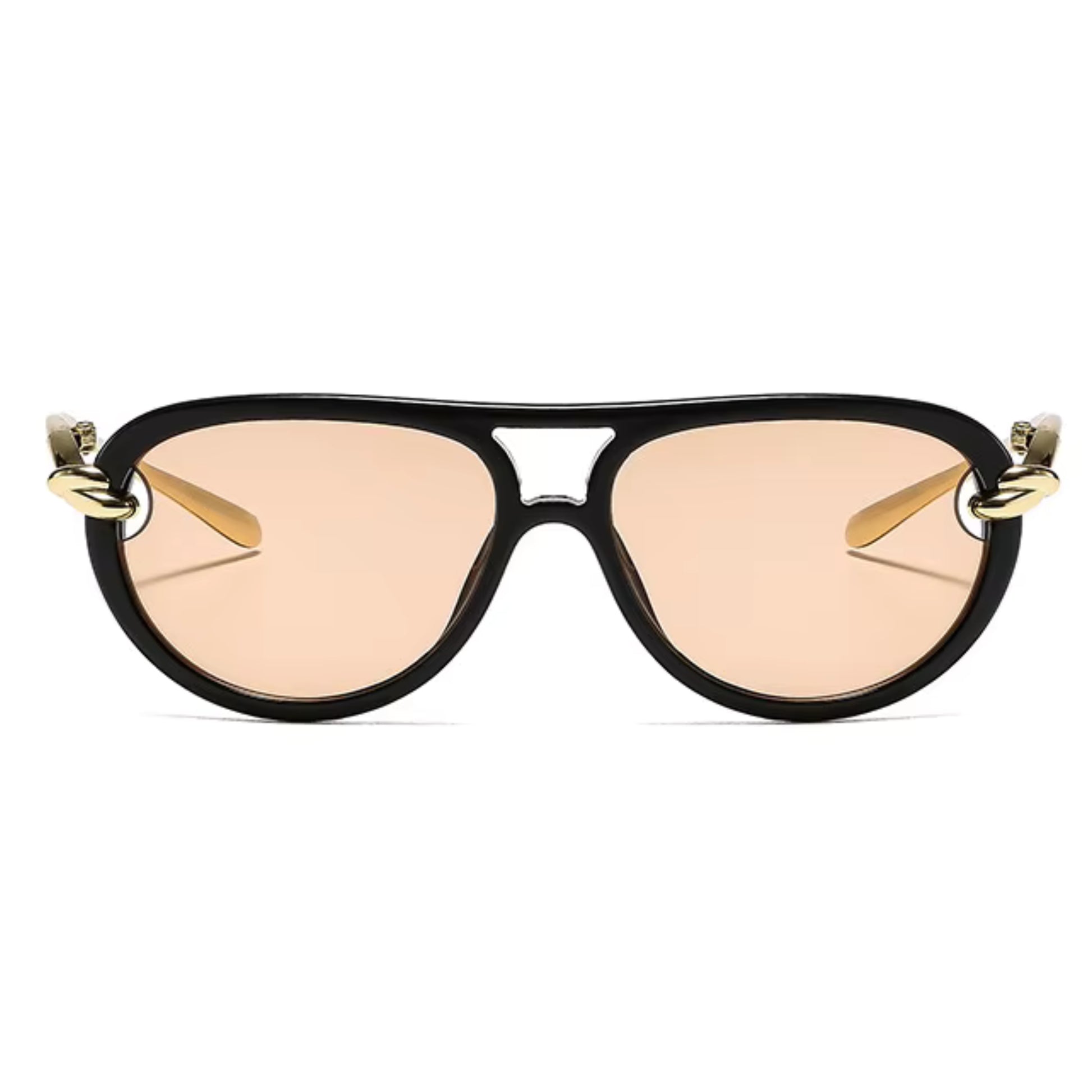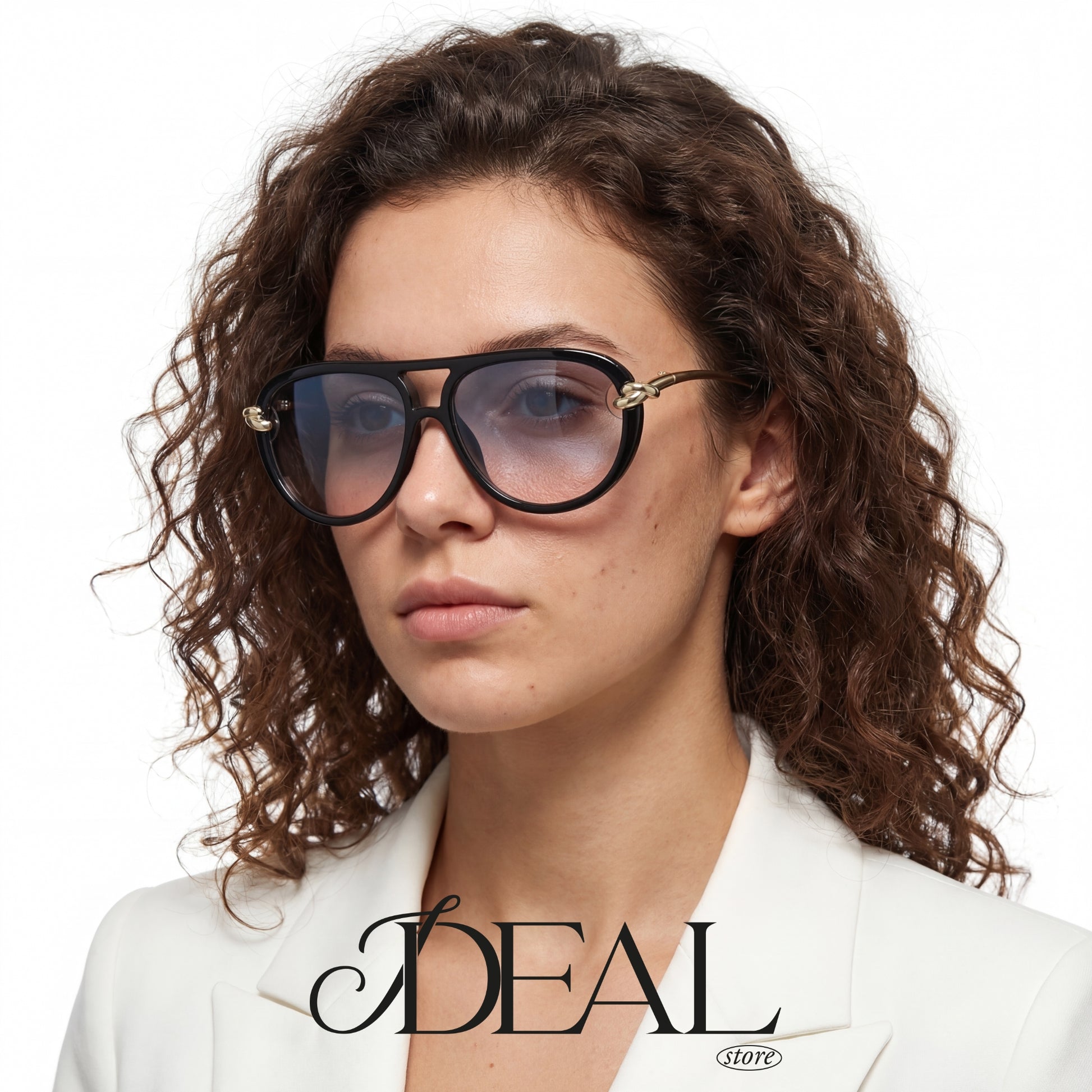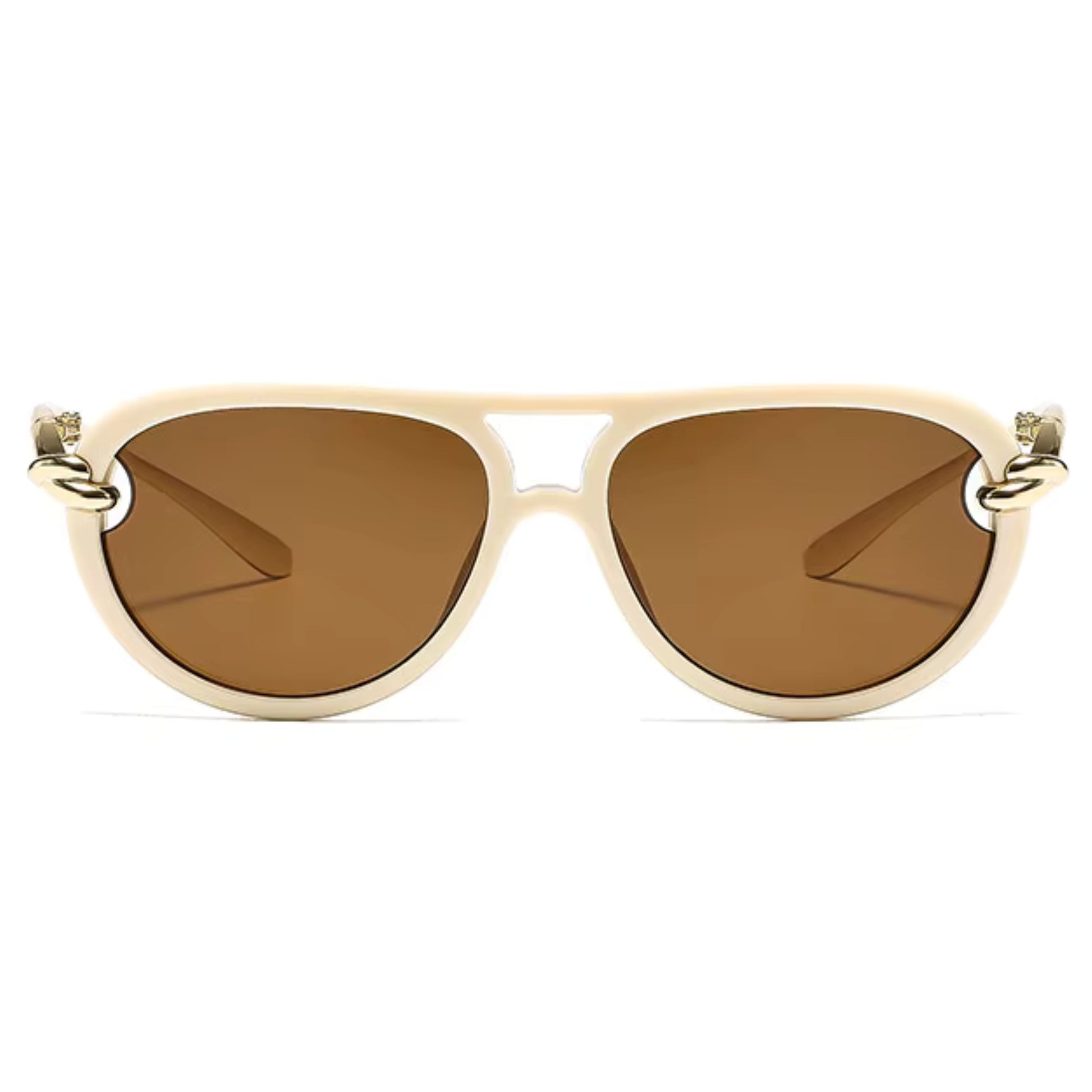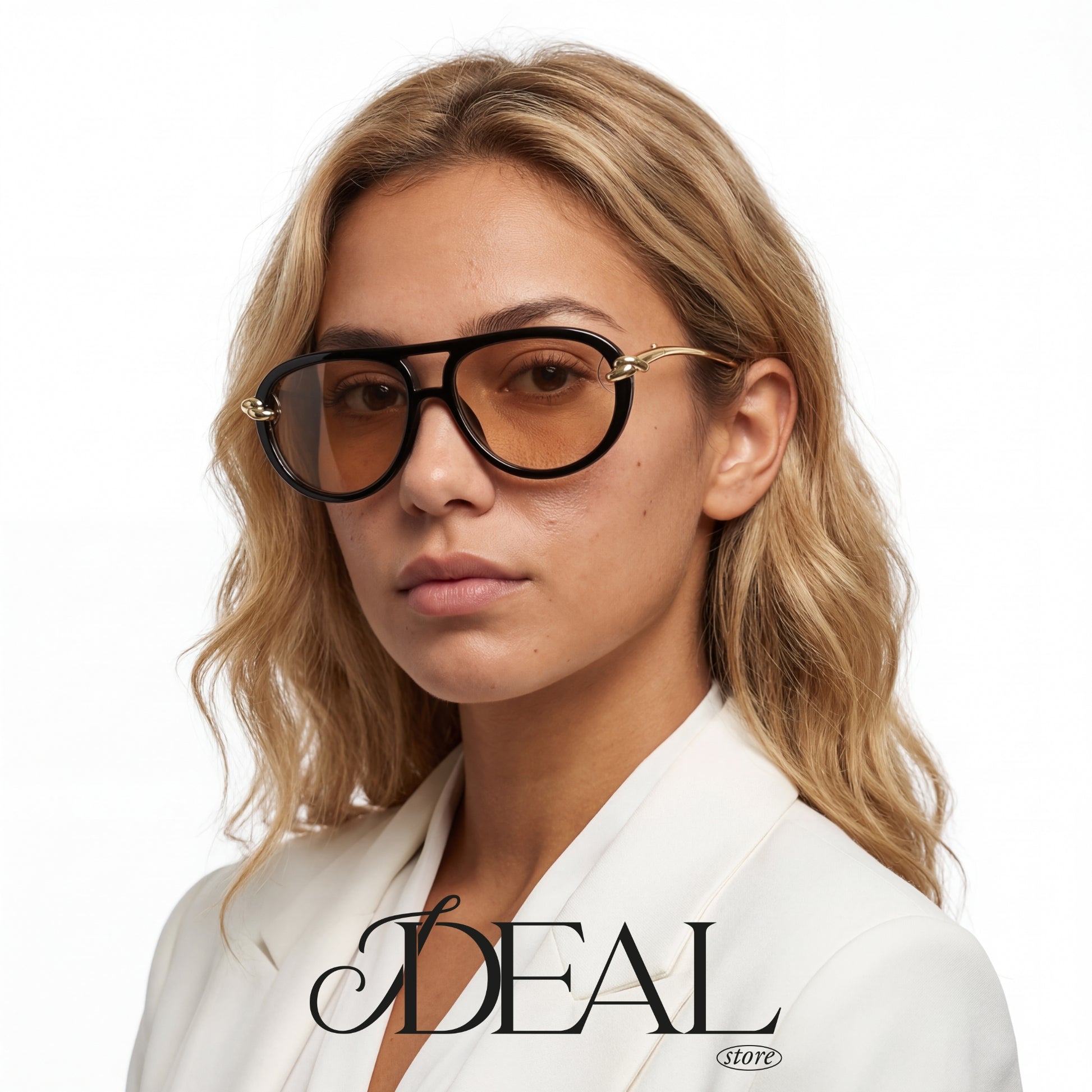 O grande destaque está nos detalhes: uma ponte dupla dourada une as lentes com leveza, enquanto delicados elos metálicos com banho dourado funcionam como verdadeiras joias, conectando a armação às hastes douradas e finas.