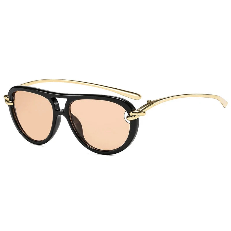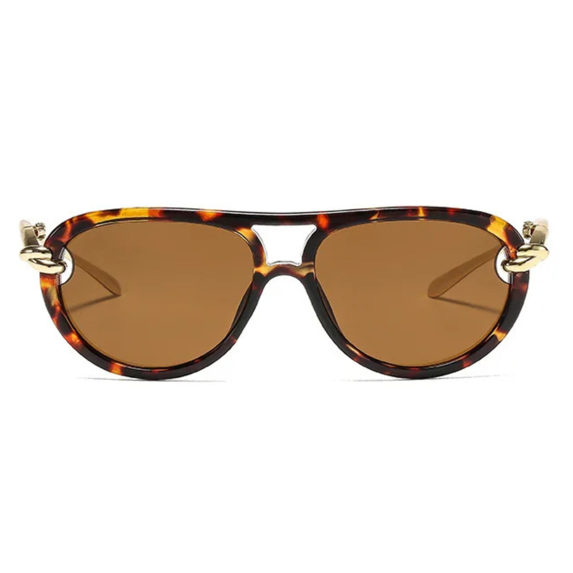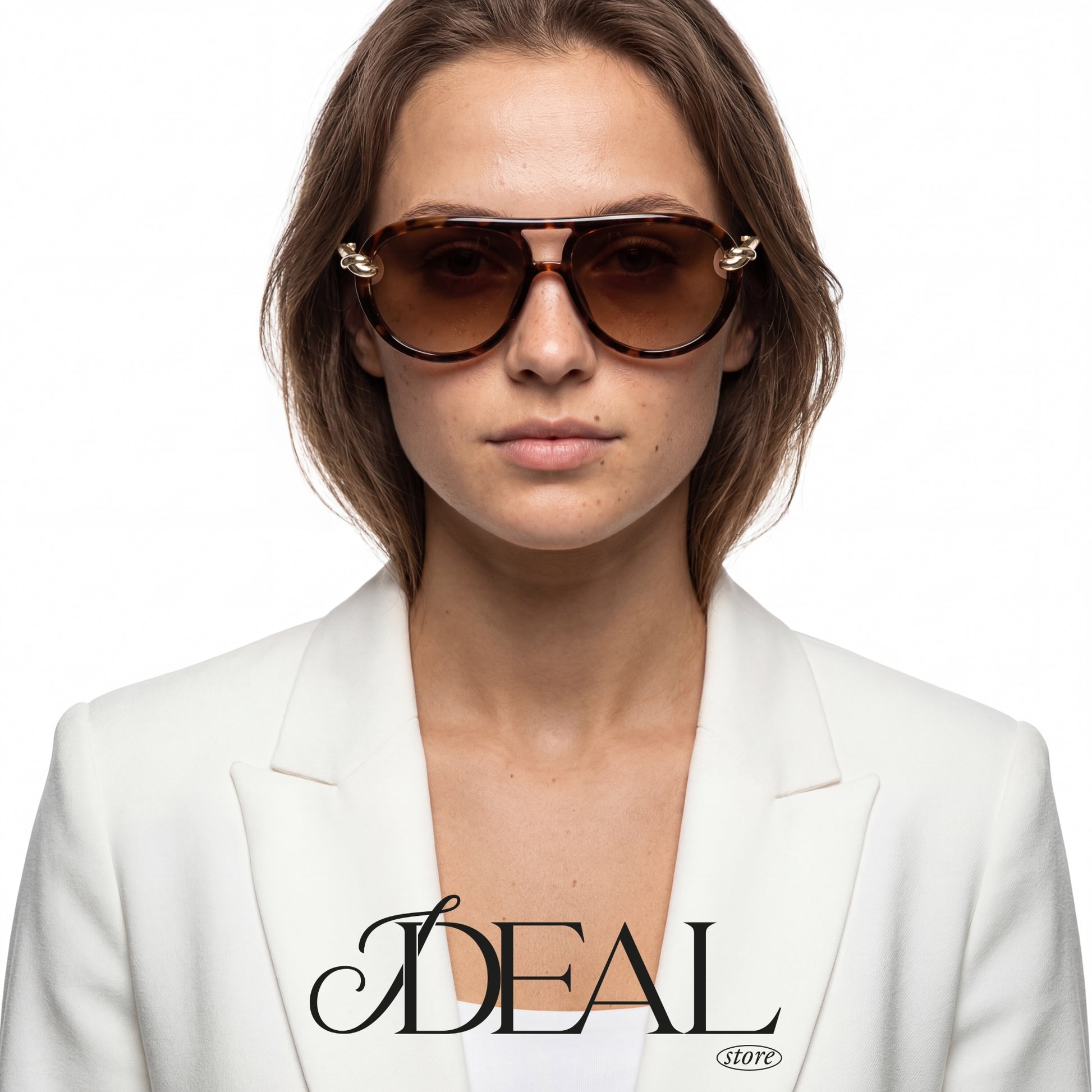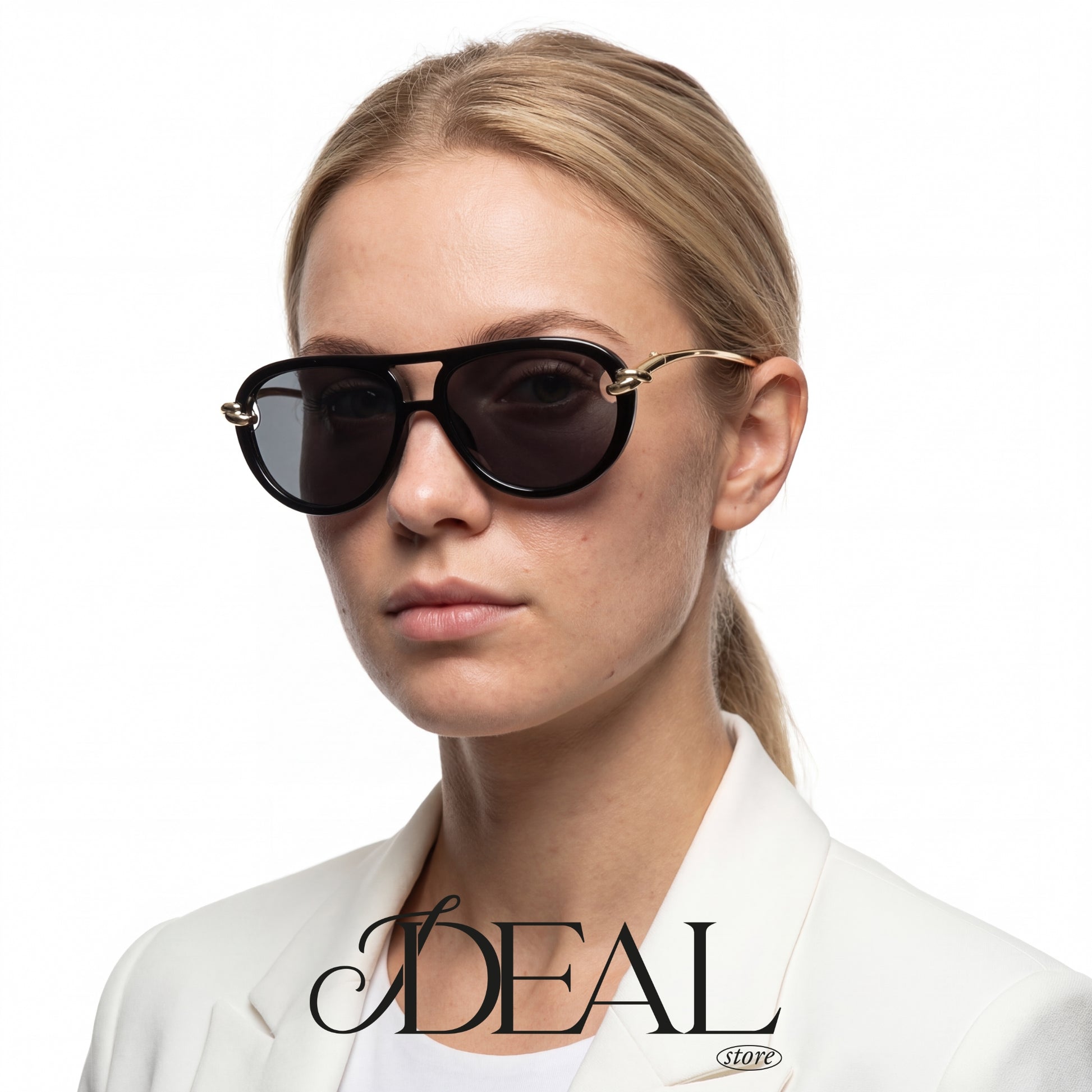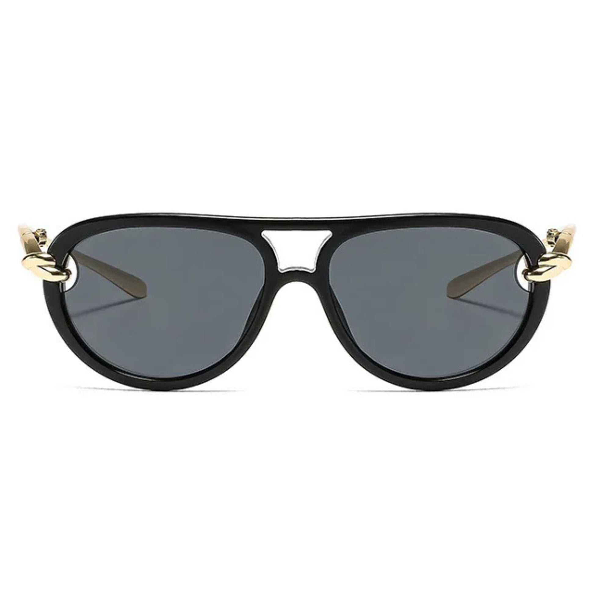 O grande destaque está nos detalhes: uma ponte dupla dourada une as lentes com leveza, enquanto delicados elos metálicos com banho dourado funcionam como verdadeiras joias, conectando a armação às hastes douradas e finas.